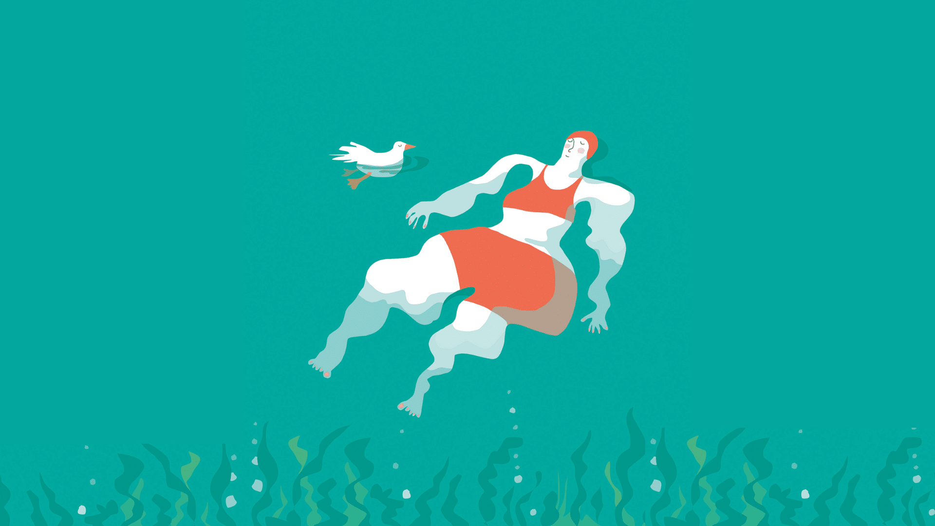 Piirroskuvassa neljä rintasyöpää sairastavaa, vesijuoksevaa naishahmoa uima-altaassa.