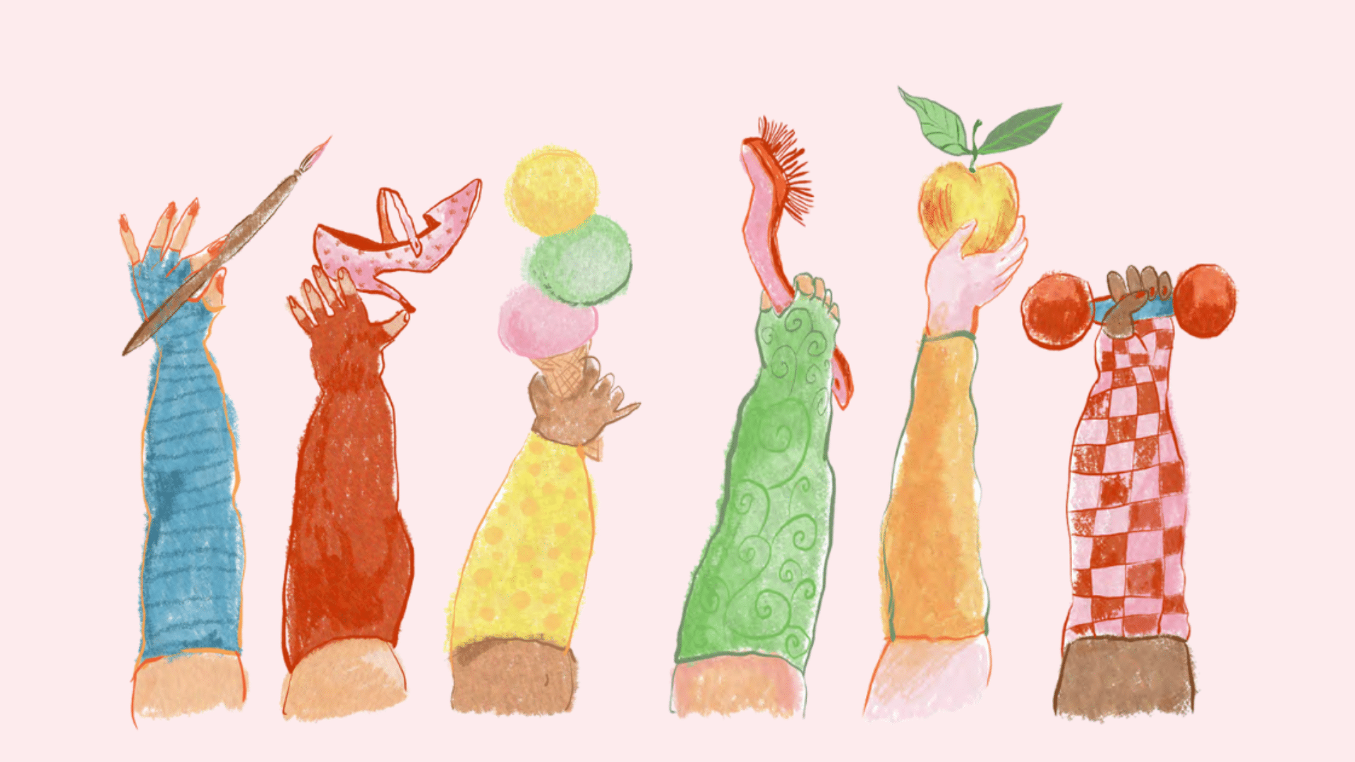 Piirroskuvassa kuusi käsivartta, joissa kaikissa värikkäät lymfaturvotuksen hoitoon tarkoitetut tukihihat. Kaikki kädet pitävät eri esinettä: kynää, korkokenkää, jäätelöä, tiskiharjaa, hedelmää ja punttia.